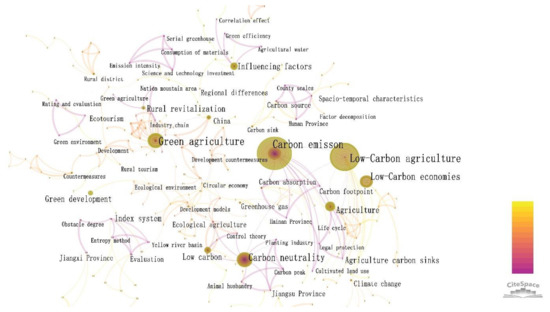 Low-carbon agriculture is modern agriculture with “low consumption, low emission, and low pollution”. It meets the objective requirements of controlling agricultural greenhouse gas emissions and slowing down global warming [41]. The low-carbon agricultural economy is developing into a new mode and concept that affects the “low-carbon” of China’s agricultural industry chain [42]. However, it also faces some problems, such as low agricultural modernization level, difficulties in large-scale land production, weak agricultural infrastructure, lack of scientific and technological innovation capabilities, and extensive agricultural production modes [43,44]. The research content involves research on the transformation pathways of promoting low-carbon agricultural development [45], low-carbon agricultural development modes under different rural regional types, and low-carbon innovation of agricultural enterprises. The development pathways of low-carbon agriculture include transforming agricultural development modes, promoting agricultural energy conservation and emission reduction technologies, reducing agricultural non-point source pollution, and improving rural energy utilization efficiency [46]. The main factors affecting low-carbon innovation of agricultural enterprises include low-carbon innovation cost, the increase of low-carbon innovation revenue, and governmental regulation [47].