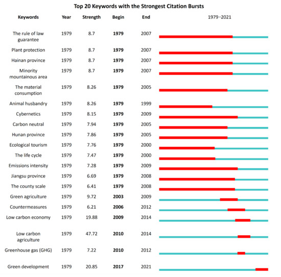 The keyword burst intensity of GLRD literature in 1979 (Figure 2) shows that the sudden staged characteristics of the keywords bursting were significant. The year 2007 was taken as the main node. Before 2007, legal guarantee, plant protection, material consumption, county scale, emission intensity, cybernetics, carbon absorption, and other keywords were research hotspots. Since 2008, low-carbon economy, agriculture, and green development have become the latest hotspots of direct GLRD research, with the burst intensity reaching 19.88, 47.72, and 20.85, respectively.