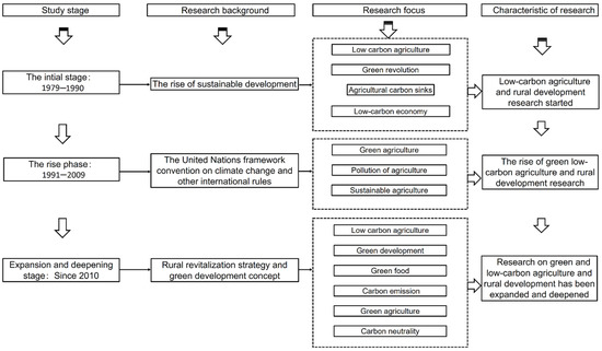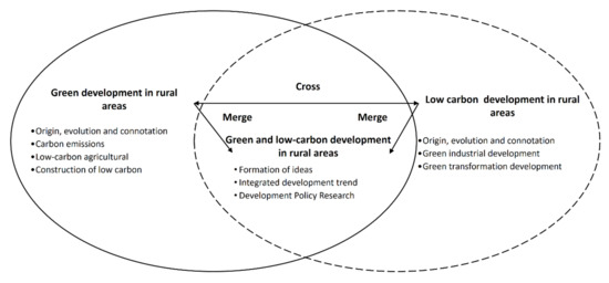 Research on GLRD has experienced low-carbon, green, and green–low-carbon integrated development research stages. Thus, three research content systems were formed (Figure 6). There is no obvious chronological order between low-carbon and green development research. These two research types both have green development and low-carbon development of agriculture as their main foci, with certain intersections in independent systems. However, with the introduction of various green and low-carbon policies in rural areas, the integration trend of the two major studies is significant.