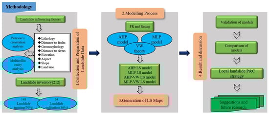 The methodological framework adopted in this study is presented in Figure 1. Firstly, data from the study area were collected, including landslide inventory, climatic data, geological map, geomorphological map, digital elevation model (DEM), and land use data. Based on these data, landslide inventory maps and maps of eight causative factors (lithology, distance to fault, geomorphology, distance to river, elevation, aspect, slope, and land use) were produced, in which Pearson correlation analysis and multicollinearity analysis were also performed for the causative factors. It is worth noting that each landslide in the landslide inventory map can be represented by a point on a regional scale. In this paper, we use the geostatistical analysis tool in GIS to select 70% (148) of the landslides in the original database as the training dataset and the remaining 30% (64) as the validation dataset. Secondly, the values of each causative factor were calculated and rated by frequency ratios, constant weights for each causative factor were calculated using AHP and MLP, and variable weights were obtained using VW theory. The study area was also divided into 29,800 evaluation units. It should be noted that due to the small size of the study area and the large dispersion of factors, an irregular polygon grid method was used to divide the evaluation cells. Four different models, AHP, MLP, AHP-VW, and MLP-VW, were constructed for LS evaluation, and a series of LS maps were generated. Finally, the models are validated and discussed, and suggestions are made for local landslide P&C and future research.
