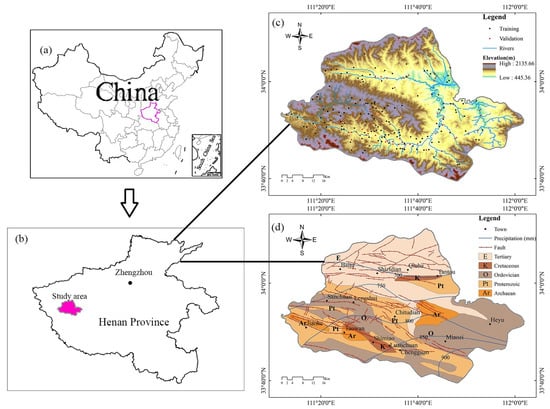 Study area information: (a) Henan province in China; (b) study area in Henan province; (c) study area with landslide inventory, elevation, and river systems; (d) study area with geology, fault, main counties, and precipitation.