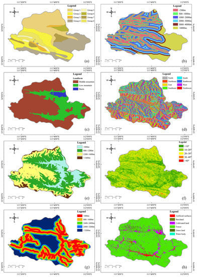 Lithology provides the material support for the occurrence of landslides and forms the basis of landslide development. The materials in different lithologies vary in characteristics including strength, density, durability, permeability, and degree of weathering [44]. The weaker (e.g., from weathering or erosion) materials provide less resistance to driving force than the stronger materials and are thus more susceptible to landslides [45]. In this study, eight groups of lithology were manually classified by similar engineering geological characteristics: group 1: metamorphic rock with strong weathering (mainly quartzite); group 2: soft sandstone quartz sandstone; group 3: stratified clastic rock with fractures; group 4: hard massive intrusive rock group (mainly granite); group 5: hard thick intrusive rock group; group 6: sandstone and argillaceous siltstone with an argillaceous interlayer; group 7: hard limestone and dolomite; group 8: hard and thin carbonate rock (Figure 3a).