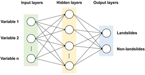 As a commonly used artificial neural network (ANN) method, the MLP model can effectively solve the binary classification problem by learning algorithms [61]. The MLP model includes multiple inputs, represented by , ,…, , n ∈ N, respectively, and uses ( + ) for outputs (Figure 4). The influence of the input signal can be measured by the assigned weights, and then the function is used to determine whether to activate the neuron. The structures of the MLP have three parts: the input layer, hidden layer, and output layer. In this study, the input layer, hidden layer, and output layer are causative factors, model processing, and evaluation results, respectively.