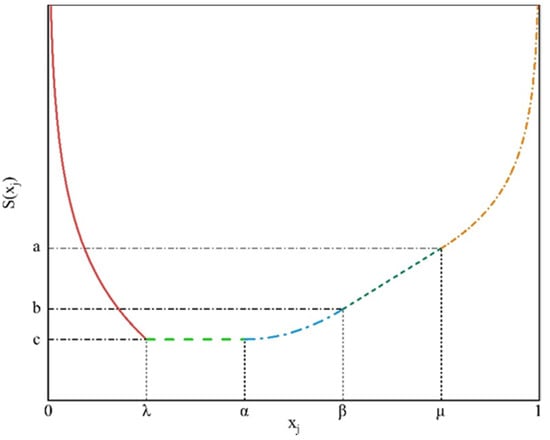 where is the scoring; a, b, and c are the appraisal strategy; k is the adjustment coefficient; and λ, α, β, μ, c, b, and a are parameters with the following conditions (0 < λ < α < β < μ < 1, 0 < c < b < a < 1).