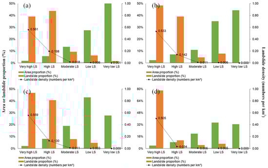 Table 3 shows the results of correlation analysis and multicollinearity analysis, respectively. It is found that all the values in Pearson’s correlation analysis are less than 0.7, and all the causative factors pass the multicollinearity diagnosis (VIF < 10 and TOL > 0.1). Therefore, all the causative factors can be used for the following LS map and analysis.