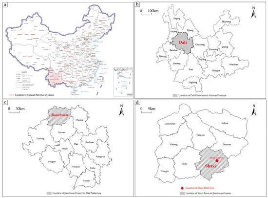 Shaxi Ancient Town is situated in Dali, Yunnan Province, China (See Figure 1). In 2001, the WMF (World Monuments Foundation) identified Shaxi as “the only ancient market on the Tea Horse Trail that still survives”. In 2002, it was included on the World Endangered Architectural Heritage List [18]. It is incorporated as “a Yunnan province famous historical and cultural town”, “a nationally famous historical and cultural city”, “a famous tourist town in Yunnan”, “108 Chinese village business cards”, and “the village directory of Chinese rural cultural heritage monuments”. This study is based on the “Historic Town Plan of Shaxi” from 2005. The plan shows where the old town reserve is. The region of protection (36.11° 11–26.19° N, 99.45°–99.58° E) has an area of 8.4 hm2. Moreover, it is situated in the North Temperate Cool Layer at an average height of 2100 m. It has an average annual temperature of 12.3 °C, yearly sunshine hours of 2400 h, and annual precipitation of 790 mm [19]. The protected area centres on Xingjiao Temple, Sifang Street, and Ancient Theatre. South and North Guzong Lane are next to it, and traditional buildings are around it [20]. The share of conventional architecture is also relatively high. The population comprises Han, Bai, Yi, Lisu, Naxi, and other ethnic groups [21]. Bai accounts for 85 per cent of the entire population and is the largest ethnic group [22]. Bai is the fifteenth most significant ethnic minority in China. Thus, this region’s traditional Bai architecture represents ancient Shaxi’s lucky culture.