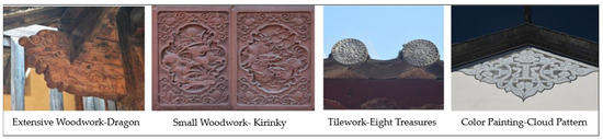 This study demonstrates that wood, stone, and other decorative arts are employed frequently. The structure has extensive woodwork, small woodwork, bright paintings, and tiles. They are the main thing that people express lucky culture. On the one hand, several research studies on lucky architectural ornamental designs [27,28,29,30]. They focused on extensive and small woodwork, ridge creatures, pedestals, and brilliant paintings. However, the tiles are rarely included as an architectural element. On the other hand, much research has investigated the tile pendant’s lucky culture [31,32,33]. Nevertheless, most have concentrated on tile pendants as a distinct architectural component. The study revealed that each building type’s lucky elements cluster into unit clusters. Moreover, tile pendants play a particular function in the manifestation of lucky culture. Based on this, the tiles should form a complete system with other elements. It is used to study the lucky details in traditional architecture. It provides a new perspective on building preservation and renovation.