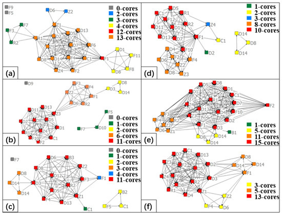 K-core diagram of auspicious elements for each building type. (a) is Xingjiao Temple, (b) is the Patron God Monastery, (c) is the ancient theater, (d) is the essential protected dwellings, (e) is the generally protected dwellings, (f) is Stores.