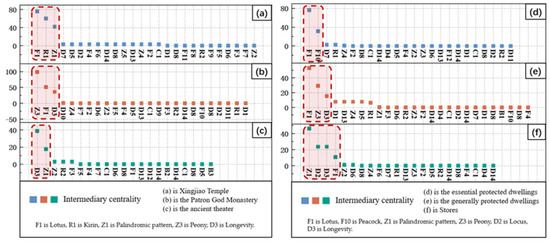 Figure 5 indicates that every building has lucky parts with high intermediate centrality. They are at the heart of the building types’ fortunate elements. Each historic town building has a primary and secondary auspicious aspect. Individually, each building type almost always contains the lucky element F1 (lotus). Moreover, it has high intermediate centrality values. The lotus is vital to the ancient town’s auspicious architecture. Furthermore, it also reflects Buddhism’s relevance in Shaxi’s old town’s fortunate architecture.