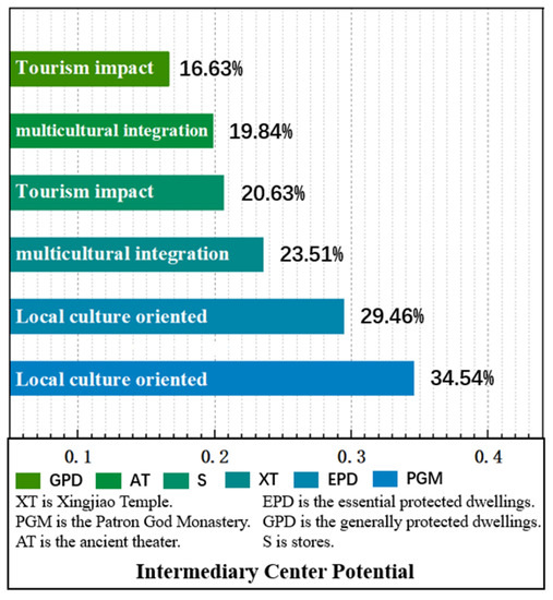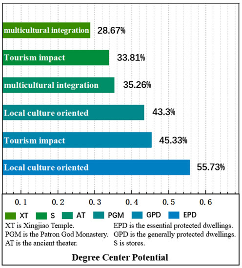 Figure 7 shows that the PGM’s intermediary centrality potential (34.54%) is high. This indicates that its overall intermediary centrality potential is high. It also shows that the overall centrality of its network is increased. This is due to the nature of the temple as a typical building of the Bai’s unique Lord worship culture. Therefore, its ability to resist the impact of foreign culture is vital. In contrast, the intermediary centrality potential of GPD (16.63%) is low. It indicates that its overall intermediary centrality is low. Meanwhile, the overall centrality of the network is low. This reflects the more homogeneous distribution of auspicious elements. It reflects the more significant impact of foreign culture brought by tourism development.