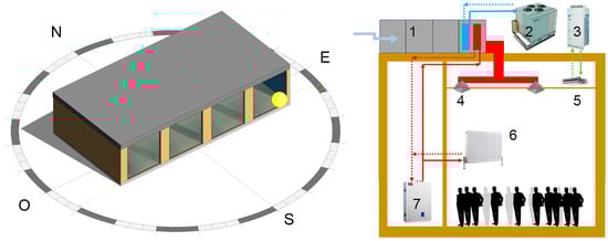 3D model created with Autodesk Revit and the energy management system simulated by all the software tools. 1. air handling unit; 2. air-cooled chiller; 3. heat pump; 4. supply air diffusers; 5. indoor split unit; 6. radiator; 7. gas boiler.