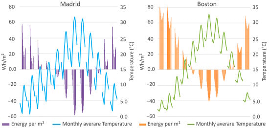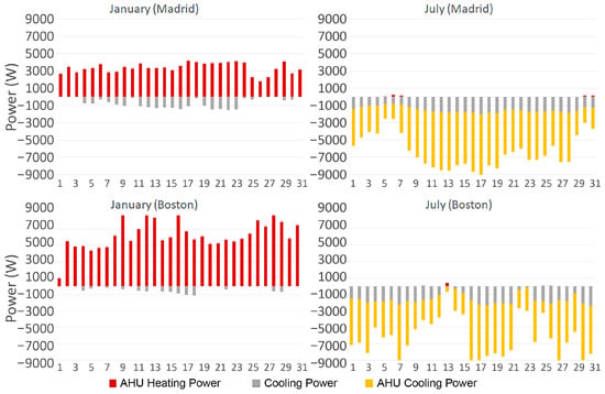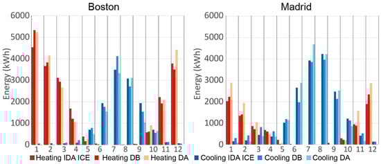 The IDA ICE engine calculates the indoor conditions using a simplified zone model for energy simulations. It has been used to compare the power levels for primary and secondary energy system components and the total energy consumption throughout the year. In addition, the model calculates the heat transfer coefficients. IDA ICE produces output files with different time resolutions. Hourly, daily, weekly, or monthly averages are shown as charts or tabulated. A particular function enables the export of the time series as a spreadsheet. Figure 6 shows the monthly performance of the case study in Boston and Madrid. The energy management system included an air-handling unit (AHU) without a heat recovery for ventilation. The AHU had heating and cooling coils. However, it was necessary to supply more energy with a secondary energy system inside the rooms. The input data led to a monthly peak load of 10,210 W for heating in January and 10,182 W for cooling in July.
