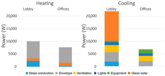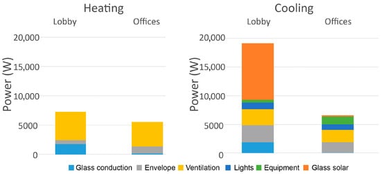 The temperature difference kept increasing until a peak value of 6°C at 7:00 p.m. The Revit and GBS presented limitations in the input of weather data. For example, the user cannot update or upload weather data from other sources as is possible in EnergyPlus. Calculating energy performance in the case study with different locations provides the users with building performance factors, such as energy use intensity, renewable energy potential, annual carbon emissions, and energy usage (fuel and electricity). Monthly heating and cooling loads, fuel, and electricity consumption are other outputs from the software energy analysis. GBS and Revit cannot calculate the internal temperature, only the heating and cooling loads, so these tools are not used to study thermal comfort. Figure 3 and Figure 4 depict the peak heating and cooling power in both locations broken down into two places, the offices and the lobby. From the analysis of the simulation results shown in Figure 3, it was concluded that the peak heating load in Boston was 17,500 W, whereas the peak cooling load was 27,850 W.