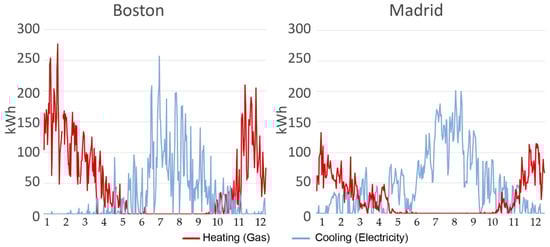 The conversion factors of fuel (natural gas) into heat energy and electricity were considered 1.1 and 1.954, respectively, whereas the coefficient of performance (COP) for cooling was 3.0. Annual heating consumption was 19,568 kWh in Boston and 8495 kWh in Madrid. The yearly cooling energy needed in Madrid, 17,160 kWh, was far more important than the cooling energy required in Boston at 12,001 kWh. Therefore, this result emphasized the advantages of carefully reviewing default parameters.