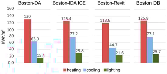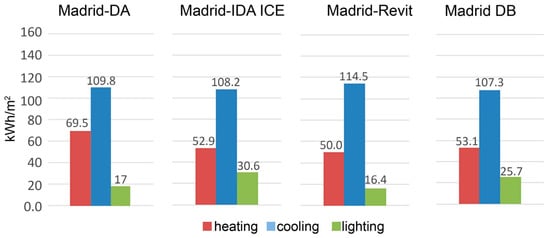 The results of the simulations did not show significant differences in the winter. The heating simulation tools gave similar results in both locations, Madrid and Boston, whereas the differences in cooling loads were much more remarkable. Figure 7 shows the results of the Boston case study simulated with all the studied tools. All simulation results showed that heating was far more important than cooling.