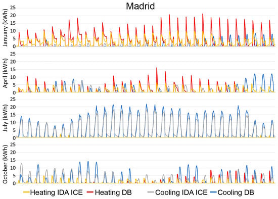 To evaluate daily and hourly predictions, general-purpose or specific-purpose advanced simulation tools were analyzed. For example, TRNSYS is an excellent option to model new technologies and analyze specific building parts. However, it was not used in this article due to its complex whole-building simulation. On the other hand, IDA ICE showed the best compatibility with Revit, and the export of the 3D model did not need extra work, so it was used in this study to represent this kind of tool. Specific-purpose tools were represented by the engine EnergyPlus with a Design-Builder interface. The larger the dataset, the more robust the evaluation of the deviations is []. Therefore, the deviations were assessed using hourly values for heating and cooling. In addition, the average value of all tools was used as a benchmark for each parameter. ASHRAE Guideline 14-2014 and the International Performance Measurement and Verification Protocol (IPMVP) [,] establish a method for measuring the precision of energy models in buildings. In addition, these documents suggest several thresholds for monthly or hourly calibration for the Normalized Root Mean Square Error (NRMSE) []. This analysis was completed utilizing monthly and hourly data for heating and cooling. Figure 10 shows the hourly energy consumption for heating and cooling in Madrid for four months to illustrate the characteristic values in all the seasons. The hourly energy consumption showed similar patterns for both tools in July, with a 77-kWh difference between the monthly cooling energy in IDA ICE and Design-Builder. The former showed a peak value of 17.95 kW, and the latter, 21.92 kW. The after-hours energy consumption in the IDA ICE simulation compensated for the highest peak value of the Design-Builder cooling energy. The same pattern is observed in January, with peak values of 21.23 kW in Design-Builder and 10.11 kW in IDA ICE. The monthly heating energy consumption was 2030 kWh and 2237 kWh for IDA ICE and Design-Builder simulations, respectively.