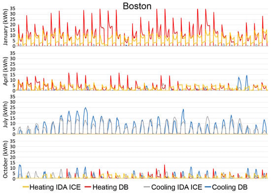 The hourly energy loads were different for both software tools in April and July. The deviations were due to the merged impact of the various sky models and the calibration of the heating and cooling systems, which allows reaching the same energy load, but with a different hourly distribution. Figure 11 shows the Boston energy consumption plots for heating and cooling for four months. The monthly energy consumption in July was 3486 kWh for IDA ICE and 4124 kWh for Design-Builder, with peaks of 16.26 kW and 25.05 kW, respectively. The same deviation can be found in January with an energy consumption of 4352 kWh and 5329 kWh for IDA ICE and Design-Builder. The behavior in April and October was different, and IDA ICE showed higher values for both heating and cooling. The energy consumption was 1688 kWh and 1212 kWh in April for IDA ICE and Design-Builder, respectively.