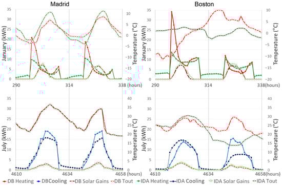 Figure 12 shows the detailed hourly results of energy consumption for each tool over 48 h in Madrid and Boston. The Design-Builder heating plot showed 20.5 kWh and 34.9 kWh peak values in Madrid and Boston, respectively. The IDA ICE pattern was steadier and showed energy consumption when the building was not used from 8:00 p.m. to 6:00 a.m. Two parameters could explain the deviations between both tools: the outdoor temperature and the solar irradiance, represented by the solar gains through windows. The latter showed similar values for both tools in summer and winter. The former showed important deviations.