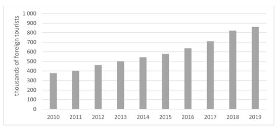 The chart shows the number of overnight stays provided to foreign tourists in the area in the years 2010–2019. Author’s compilation based on GUS data (accessed on 20 March 2021).