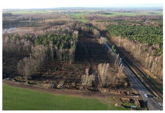 The photo shows the felling of trees alongside the effective S3 expressway in the Wolin Commune. Here, 126.32 ha of forest areas were cleared for the road; however, due to replacement plantings, the size of forest areas in this area has increased by 57.86 ha (Table 1). Source: https://conadrogach.pl/ (accessed on 20 September 2022).