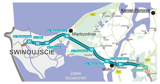 The course of the S3 expressway ending with a tunnel under the Świna River, which is to facilitate access and increase tourist traffic capacity in the direction of the city of Świnoujście.
