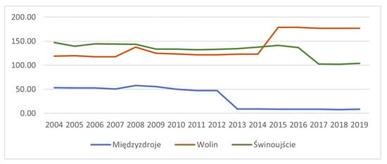 Analysis of the change in the area of forest land in hectares in the municipalities of Międzyzdroje, Wolin and Świnoujście in the years 2004–2019. Own study based on GUS data (accessed on 18 April 2021).