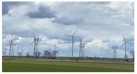 The development of wind farms has had a significant impact on the dynamics of landscape change in the area studied (Figure 8). There are 15 wind farms, with a capacity of 2 MW each, in the area of the Wolin commune. A wind farm covers an area of 225.2 ha. The further expansion of wind farms and their impact on the landscape in Poland was stopped by the Act of 24 April 2015, amending certain acts in connection with the enhancement of landscape protection tools (Journal of Laws of 2015, item 774). The basic terminological issue that decides the purpose, scope of research and the manner of conducting research is the definition of the landscape as an object influenced by wind farms. The essence of landscape has been the subject of numerous syntheses presented, among others, by Myga-Piątek [33] and Santos [34]. The most visible effect of the impact of wind power plants on the landscape is the reduction in the emission of harmful substances to the environment. The ecological effects of the construction of wind farms are: the noise that accompanies the operation of a wind turbine (mechanical and aerodynamic), the introduction of technical elements into the natural landscape (visual effect), the possible migration of animals from the areas where the power plant is located, threats to birds resulting from the possibility of a collision with the rotating blades of a power plant, the stroboscopic (flickering) effect, micro-vibrations and electromagnetic disturbances.