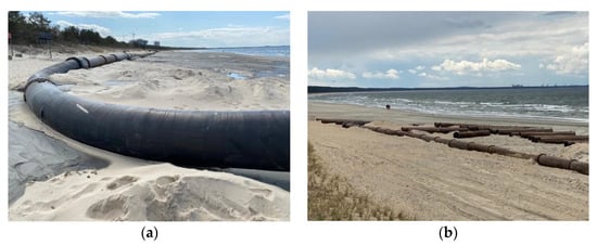 Counteracting the decline in the surface of the beaches as a result of the rising water level in the Baltic Sea. The technical process of increasing the level of the beach in Międzydroje using sand from the excavation for the deep-water Świnoujście gas terminal. Structure to strengthen and raise the level of the beach (a) main pipe transporting sand to the beach; (b) a piping system to transport the sand to the beach before installation. Photo by Z. Paszkowski.