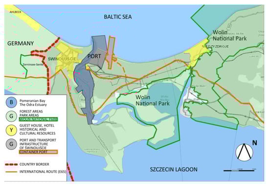 The research area is covered by a transportation system that features all branches and types of transport. One of the biggest Polish ports in the Baltic Sea is located here—the integrated Port of Szczecin-Świnoujście. The location of the port in Świnoujście, which has a lot of benefits due to the proximity of international transportation routes, is key to the observed as well as planned development of intermodal infrastructure, which causes changes in the features of existing areas and expands them at the cost of natural land (forests, agricultural areas and grassland). The dynamic development of investments in the transportation sector that is both observed and planned in the analyzed area has a negative impact on the natural environment in several ways—the annexation of forested and agricultural areas, environmental pollution, the interruption of ecological corridors, the destruction of endemic species of flora and fauna, and the interruption of the ecological balance [6,7].