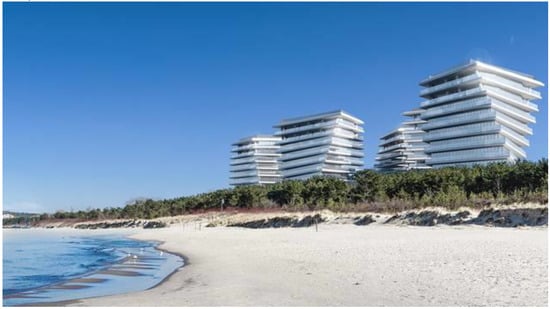The problem of the development of investments in the coastal belt results from the large, constantly growing demand for spending holidays at the Polish seaside and climate change [37]. On the one hand, this is due to the improvement of the economic situation in Poland, its opening up to neighbors from the West and South of Europe, their diminishing concerns about the quality of tourist services in Poland, the difficult international situation and the threats of terrorism in areas outside Poland that are considered to be tourist hubs, as well as issues related to the pandemic. On the other hand, the growing demand for residential premises in the coastal zone and the still existing possibilities of locating investments on the seafront, right next to the beach, have attracted large development companies, which see these investments as an opportunity to generate large profits. Examples illustrating these trends include the Radisson and Hilton hotel complex in Świnoujście, the Aquamarina skyscraper and the Wave apartment complex under construction in Międzyzdroje (Figure 12), the project to build two twin skyscrapers right next to the beach in Międzyzdroje (Figure 13a), and the gigantic Gołębiewski hotel in Pobierowo (Figure 13b).