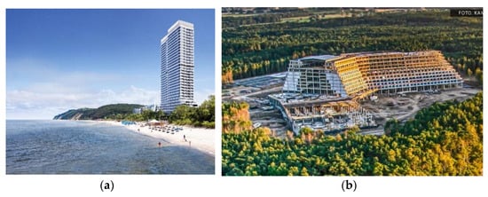 New development investments on the coastal belt. (a) The twin skyscrapers in Międzyzdroje—a project with building permission, (b) Gołębiewski Hotel in the village of Pobierowo—under construction.