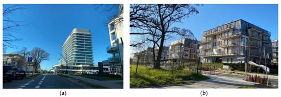 (a) Hotel Radisson, 15 floors in height, dominating the Świnoujście seaside, the highest building up to now in the research area, sets a new paradigm for seaside structures. (b) Guesthouse buildings in the area of the spa district of Świnoujście. Photos by Z. Paszkowski.