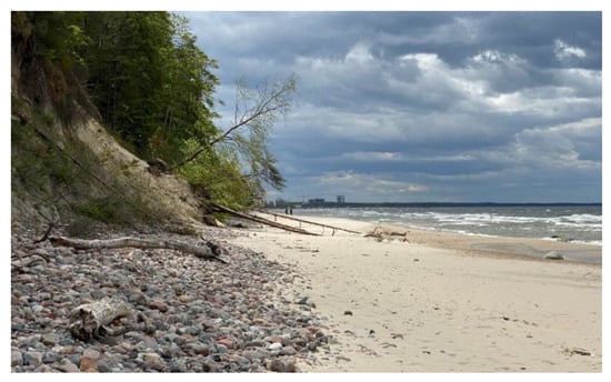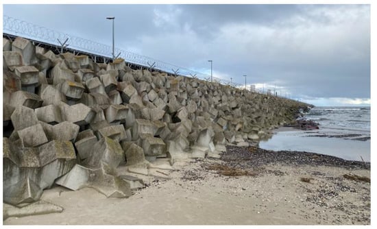 The average global sea level rise is accelerating significantly. Satellite data from the last 25 years clearly indicates that the acceleration of this growth is related to climate warming and the melting of the Greenland and Antarctic glaciers [22]. Progressive climate change, as well as natural factors on the coast, are changing the border between land and sea. The research area includes the Wolin National Park, with an almost twenty-kilometer-long coast of the Baltic Sea. A large part of the coastal landscape is an abrasive and scree cliff, which is characterized by a sandy and gravel slope inclined at the angle of a natural chute. As a result, and additionally in the case of a parallel abrasion process, there is a continuous loss of the seashore and progressive erosion of the coast (Figure 16). This is influenced by the structure and morphology of the terrain, as well as by the number and strength of storms and precipitation. The consequence is a landslide, i.e., a sudden displacement of earth masses along the slip surface under the influence of gravity. In addition to natural factors, human activities can influence coastal erosion. Disturbances in the natural flow of sediments in the coastal zone as a result of, for example, the expansion of port breakwaters, shore fortifications and strips may aggravate the deficit of crumb material in the vicinity of the cliffs. The solution used to strengthen the pier with concrete blocks does not create such a chance and is an man-made example of the negative changes in the landscape (Figure 17).