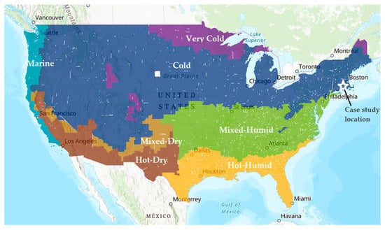 - Burleyson, C. Building America Climate Regions, version 7.3; Web USA. 2015. Available online: https://www.osti.gov/dataexplorer/biblio/dataset/1617645 (accessed on 12 October 2022).