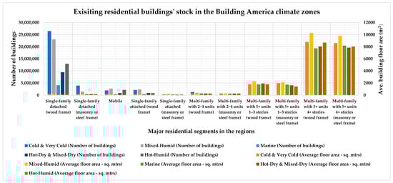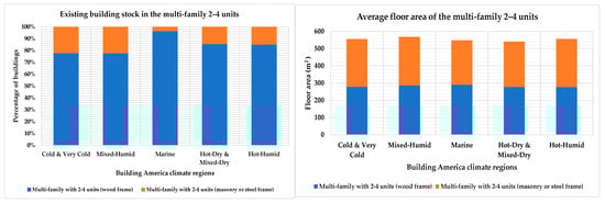 More than 90% of US residential buildings are constructed with timber materials [1,2,49], and over 40% of the existing buildings in the study area were built more than 70 years ago [1,2,50]. Baechler et al. [51] and the US Department Energy Building America Program [52,53] defined the main “Building America” climate regions (i.e., marine, hot-dry, mixed-dry, hot-humid, mixed-humid, cold, and very cold) using a similar illustration as shown in Figure 1. Additionally, the technical report by Reyna et al. [54], and the dataset from [55] provide further explanation regarding the various building climate zones. Figure 2 shows various categories of residential building stock in “Building America” climate regions in the United States. Additionally, Figure 3 showcases the existing building stock and average floor area of multi-family 2–4-unit buildings in these regions. The buildings examined in this case study fall into the category of multi-family 2–4-unit buildings.