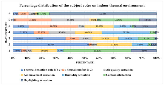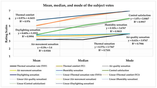This study assessed the mean, median, and mode values of the votes on the indoor thermal conditions of the units as shown in Figure 7. Correlations between those parameters were also assessed. Some of the initial findings that can be deduced from the figure are as follows. Firstly, correlations exist between the mean, median, and mode values of all the variables. The mean values for air quality sensation and thermal sensation exceed the median values for those parameters. There are no significant changes in the mean, median, and mode values of air movement sensation and humidity sensation. Significant changes are noted between the mean, median, and mode values of control satisfaction, thermal comfort, and daylighting sensation. Additionally, on the rating scales, thermal comfort and daylighting sensation votes received the highest ratings for each of the subjects (Figure 8).
