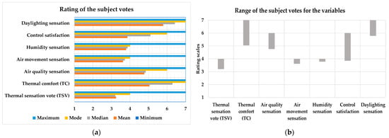 (a) Rating and (b) range of the subject votes on the general indoor thermal environment of the case study buildings (thermal sensation: 1—cold to 7—hot; thermal comfort: 1—very uncomfortable to 7—very comfortable; air quality sensation: 1—very stuffy to 7—very good; air movement sensation: 1—very little to 7—very much; humidity sensation: 1—very dry to 7—very humid; control satisfaction: 1—very dissatisfied to 7—very satisfied; daylighting sensation: 1—very dim to 7—very bright).