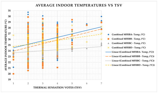 Chart showing the average indoor temperatures versus thermal sensation votes to predict the neutral temperatures within the dwelling units. MFRBA—multi-family residential building A; MFRBB—multi-family residential building B; MFRBC—multi-family residential building C; MFRBD—multi-family residential building D.