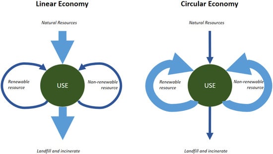 The circular economy is an advance of the linear economy, as shown in Figure 1. This can be seen from the circular goal of overcoming problems regarding waste generated by a linear system. A linear economy design has the principle of the “take-make-dispose” approach. This means that raw materials are collected and then transformed into usable products until they are discarded as waste. Value is created in this economic system by producing and selling as many products as possible [22]. Producers, as well as consumers, are blind to what happens with the products after they are broken or become obsolete. Sometimes, planned obsolescence is built-in, even for products that could potentially last longer, to make space for brand-new ones [23].