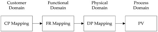 Axiomatic design is a scientific and structured framework that can be applied to a design process. It works based on a mathematical and analytical thinking process without trial and error experiments [38]. Its design model contains four domains: customer, functional, physical, and process. Under each pair of these four domains, the domain on the left represents “what we have to achieve,” whereas the domain on the right represents the design solution of “how to satisfy the requirements specified in the left domain”. To go from “what” to “how” requires mapping.