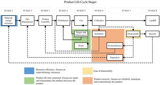 The identified characteristics are then matched with the product life cycle analysis. This cycle with eight stages, as shown in Figure 4, aims to describe the process of developing the product starting from the material preparation until the product is used and going further to the landfill. Figure 4 is used to illustrate the circular design concept from the product life cycle. The goal is to optimize the use of resources and products before the discarding process that concerns cost, energy, safety, etc. Six circular design aspects are identified, as shown in Figure 4; these are resource efficiency, safe material for the environment, product lifetime extension, ease of disassembly, and product recovery. The discussed resource includes material, energy, and all kinds of input for developing the product (stage 1). When the product or system has minor damages and errors, they can be overcome by repairing and maintaining the product so that it can be reused (stage 5). Product reuse and repair aim is to extend the product’s lifetime. The main objective of designing a circular design is to optimize the use of materials through the recycling process (stage 8) and utilize the discarded component through remanufacturing and repurposing (stage 7) to be used again in stage 2 after disassembly (stage 7). On the other hand, if the product has significant damage, the product will be collected and refurbished (stage 6) if possible, or the recovering process is applied.