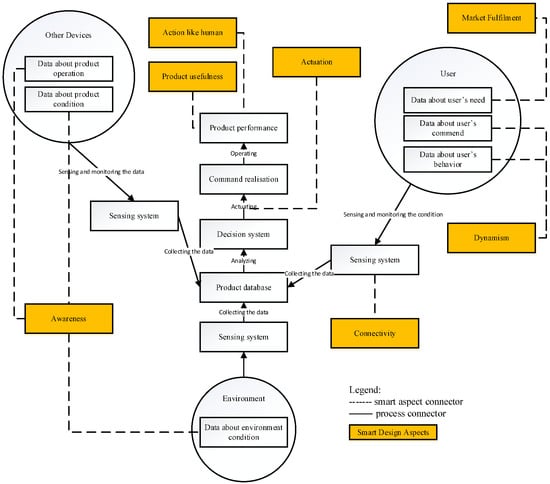 With the work of Maass and Janzen [34] as a reference, this study uses the product performance realization process shown in Figure 5 to establish the quality requirements for smart design. Smart product focuses on three main components that interact with each other. These components are the user, environment, and other devices. The relevance and viability of each process is determined by considering the roles of these three components. The process starts with the data gathered from the environment, and smart products use a sensing system to monitor and register data. These data are then collected in a database and are further analyzed using an algorithm or a decision making system. More than the data from the environment, the database also captures information from the user as well as its interaction with other devices. Each decision is then actuated into a command that triggers the product to be in operation. This illustration gives a clear idea of the product and helps the researcher identify what aspects are important for smart products. Through matching of the literature survey, seven aspects of smart design are concluded, such as actuation when decision systems are translated to commands, and action like human and product usefulness for product’s operation or performance.