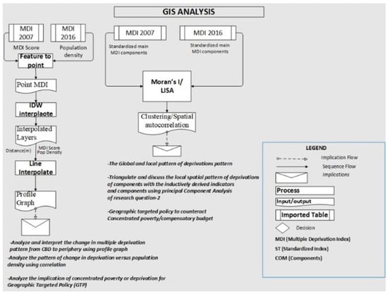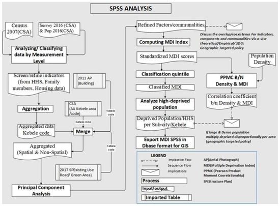 The descriptive research design uses percentages, maps, or graphs to describe the situation. Moreover, the author’s previous research on case studies of peri-urban and squatter settlement areas of Addis Ababa [], supported by the corresponding image interpretation for morphology and physical observation, enriched the interpretation and discussion of the findings. The correlational research design analyzes the relationship between multiple or two variables using the analytical methodologies of PCA, PPMC (Pearson Product Moment Correlation), LISA, and Moran’s I. The unitary weighting method and asking for opinions are simple but subject to arbitrary and subjective judgment []. The MSAT statistical weighting and ranking deprivations based on component (factor) scores provide an advantage relative to the non-statistical weighting method. In MSAT statistical weighting, the obtained factors clarify the general concept via an empirical link among a set of indicators, which makes the MSAT method appropriate for policy targeting [,,]. MSAT’s inductive approach derives indicators, components, and patterns from observation and the development of explanations (theories) through a series of hypotheses []. PCA overrides other MSAT methods for the MDI model. The benefits of PCA are an orthogonal transformation of the original variables into a new set of variables, maximizing the variance of variables, and reducing redundancy. In addition, PCA derives small diagnostic factors from a large set of variables, and it is advantageous for giving more weight to unequally distributed assets between cases [,,,]. The study joins PCA results in SPSS 20 with the Kebele spatial unit of AA in ArcGIS 10.8 for GIS-based analysis. The overall methodological flows and procedures are illustrated in Figure 2 and Figure 3. The methodological procedures are specified in a step-wise manner as follows: