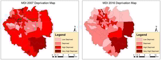 For the MDI 2007 classification, the most deprived quarters were pervasive in most parts of the city, while the intensity of deprivation was less for most of the intermediate areas. Yet, for the MDI 2016 classification, the most deprived areas showed vivid clustering in the inner-city slums and peri-urban informal settlements, while the intermediate and formal suburban areas were less deprived quarters. See Figure 4 for MDI 2007 and MDI 2016 deprivation classifications.