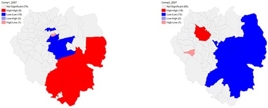 LISA cluster map for MDI 2007 component one [LHSS] on the left and component two [HEPSV] on the right.