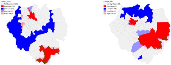 LISA cluster map for MDI 2007 component 3 [VUSG] on the left and component 4 [PHSC] on the right.