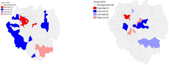 For components 2007 and 2016, the result of Moran’s I indicated significant positive spatial autocorrelation, while the strength of the “Moran’s I” coefficient was high for MDI 2007, relative to MDI 2016, due to the consideration of a multitude of census indicators. The global “Moran’s I” for MDI 2007 and MDI 2016 indicated that neighborhood units with high deprivation scores were close to each other, revealing the spillover effect of poverty concentration on adjacent neighborhoods. Component 2 (HEPSV) of the MDI 2007 demonstrated strong positive spatial autocorrelation, relative to other MDI 2007 components, justifying how the deterioration of public health and vulnerability formulated a concentrated poverty pattern and spatial inequality. For MDI 2016, Moran’s I result was positive and strong for component 3 (EVIN), compared to other MDI 2016 components, verifying how a lack of road infrastructure and green space per capita leads to a pattern of concentrated poverty. See Table 4 for the result of the global “Moran’s I” index.