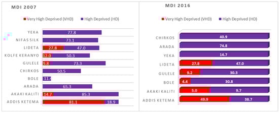 In Ethiopia, urbanization has not been associated with a commensurate increase in economic prosperity. For instance, 23.5 percent of households (HHs) in Addis Ababa have recently reported the presence of unemployed adults []. To achieve middle-income status, Ethiopia needs to address the challenges of rapid urbanization, such as deepening poverty, high unemployment rates, the rapid expansion of informal settlements, an acute housing shortage, and the growing risk of environmental hazards []. Pro-poor spending in Ethiopia amounted to 65.7 percent of the total public expenditure in 2015/16 [], while the reduction in non-monetary welfare (health, education, sanitation, and access to water) was at a low level []. Ethiopia should meet SDG target 1.2 of reducing by half the proportion of men, women, and children of all ages living in poverty in all its dimensions []. The MDI (Multiple Deprivation Index) is a means to link and monitor SDGs since it considers and weighs a multitude of problems. There is a link between SDG 4 on education, SDG 1 on poverty, and SDG 8 on employment. The above links are justified by the fact that education reduces poverty by increasing people’s income and improving workers’ productivity and productive capabilities. Yet, there is less evidence of the link between urban development (SDG 11) and education (SDG 4), except for the link between SDG 4 on education and SDG 11 on disaster management [].