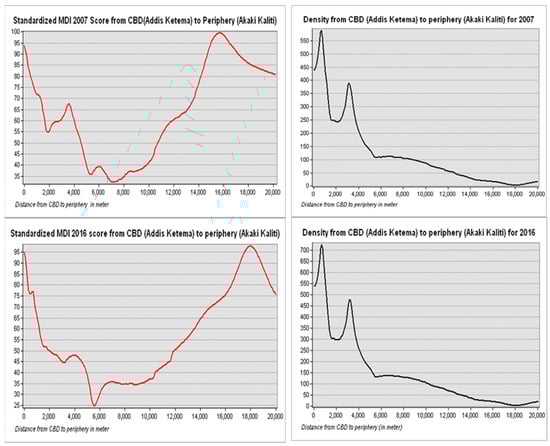 The empirical findings from the 122 World Bank poverty-targeted social programs showed that sector-based spending benefits the wealthy and that a quarter of these programs benefit non-poor people []. The preceding justifications point to the need for a policy framework, tools, and budget to better target vulnerable populations [] living in high-poverty areas. In such cases, the MDI provides a tool to target and prioritize deprived populations. Currently, urban inequality and poverty polarization are rising in Ethiopia, which requires welfare-oriented strategies to better target compensatory budgets for vulnerable women and uneducated and impoverished HHs []. The analysis of locations with large, disproportionally deprived populations will assist in justifying the need for compensatory area-based policy to reach the more deprived populations, reduce spatial inequality, and address their preferences through participation and partnership. Given this fact, the third and fourth research questions address the relationship between deprivation and population size and density. The third and fourth research questions are stated, respectively, as follows: (3) What proportions of the sub-city population of Addis Ababa were most deprived? (4) Are there statistical correlations and spatial relationships between the MDI deprivation score and population density? The rationales for area-based policy are debated and justified by relating the findings of the above research questions to the theoretical, SDG, and empirical frameworks. The proportion of the most deprived population by sub-city is analyzed by descriptive statistics, and the statistical relationship between the deprivation score and population density is analyzed using PPMC (Pearson Product Moment Correlation). By comparing MDI 2007 and MDI 2016, the study interprets the spatial profile and trends of MDI deprivation scores as well as population density. The profile section stretches from the old inner city CBD (Central Business District) of the Addis Ketema sub-city to the Akaki Kaliti sub-city. Given that it was an old peri-urban informal settlement prior to the 2007 census, the profile trend extends to the Akaki-Kaliti sub-city fringe.