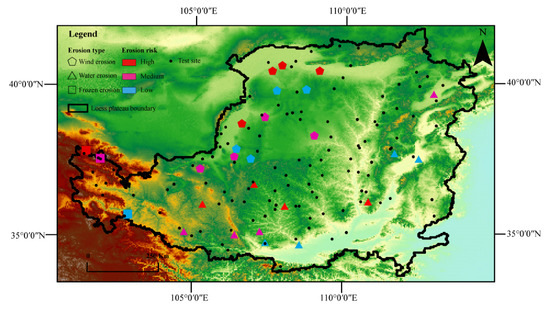 The soil erosion inventory map (SEIM) is a 1:500,000 scale map that includes information on the erosion risks and types of the Loess Plateau, which was obtained digitally based on the results of the field survey. This map mainly possesses three types: water erosion, wind erosion, and freeze-thaw erosion, while the risk can be classified into three levels: high, medium, and low.